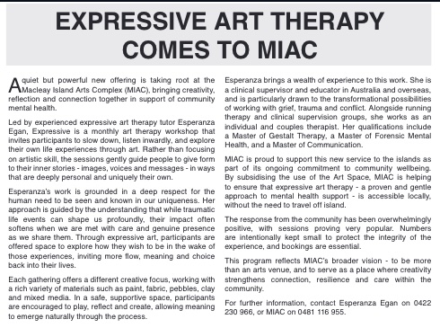 Expressive - Honouring the stories your body holds - In this playful art therapy workshop, immerse yourself in somatic and creative explorations to move from stuckness into the expression of the stories that no one else can tell. Each monthly gathering will produce a unique piece of your own life experience. Download the brochure